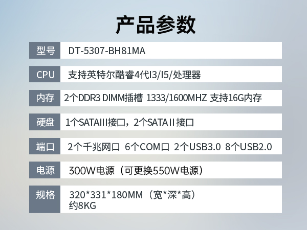 三亿工控DT-5307-BH81MA是一款壁挂式工控机,采用酷睿4代13/15/17处理器,内存2个DDR3,支持16G。300W额定电源。单面出线,支持7个扩展槽,2个千兆网口,6个COM口,支持多种操作系统,欢迎定制。